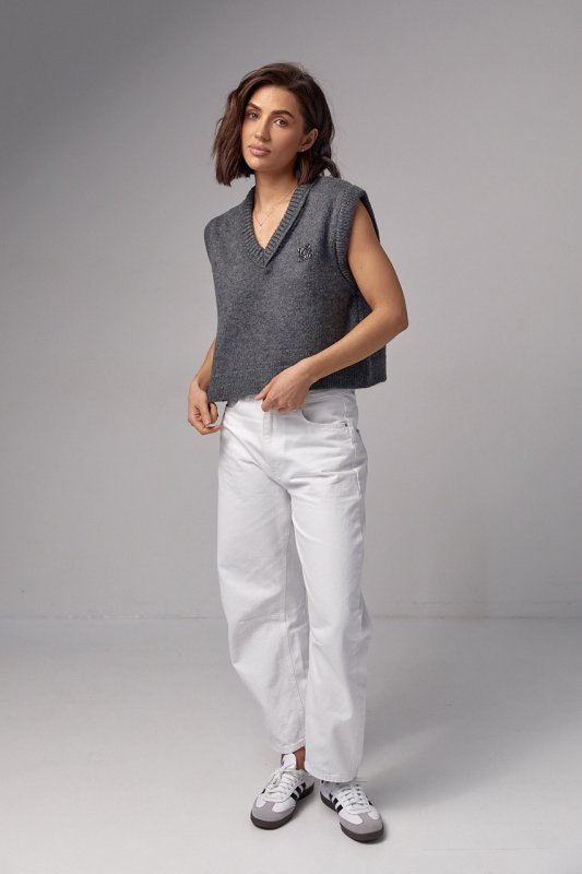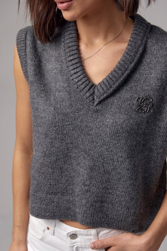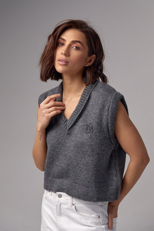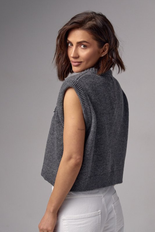 Эта модель в стиле оверсайз полностью виполнена в технике английской вязки, а проймы дополнены фактурной вязкой рядами из лицевых и изнаночных петель. Горловина V-образная, прямой низ заканчивается манжетой с тонкой резинкой, вшитой по краям. Спереде, с левой стороны, жилет украшаеь металическая брошь, которая надежно пришита.