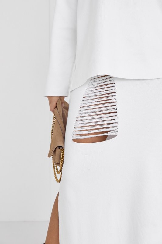 Первая причина влюбиться в нашу новинку – приятная на ощупь ткань. Вторая – идеальный oversize крой, который не только на пике популярности, но и подарит максимум комфорта. Третья причина - оригинальный декор в виде вырезов на юбке и спинке джемпера с нитками, которые расположены рядами. И, наконец, четвертая причина – возможность носить отдельно каждую вещь и получить еще больше вариантов впечатляющих образов!