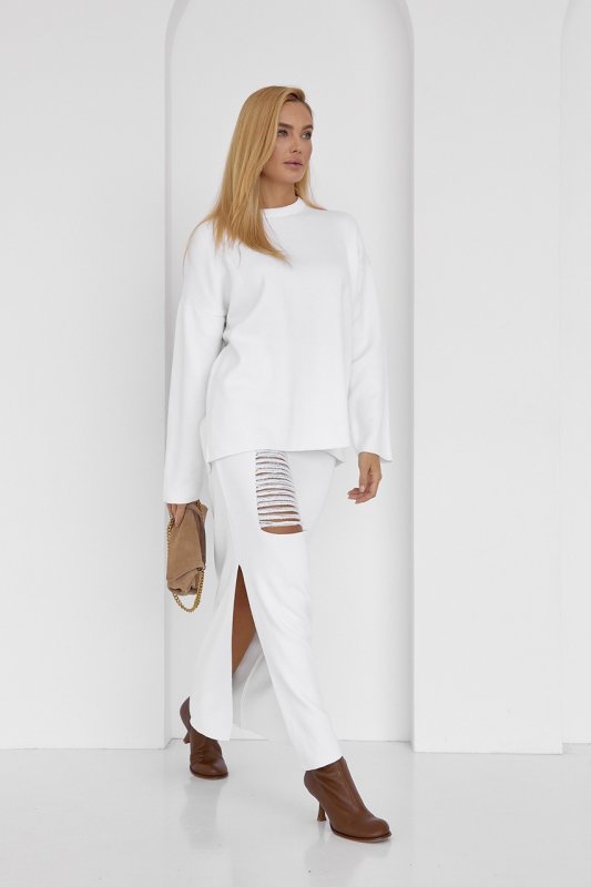 Оригинальный костюм-двойка, состоящий из свободного джемпера и прямой юбки с распоркой - твой готовый к выходу look, который ты также можешь комбинировать с другой модной одеждой.