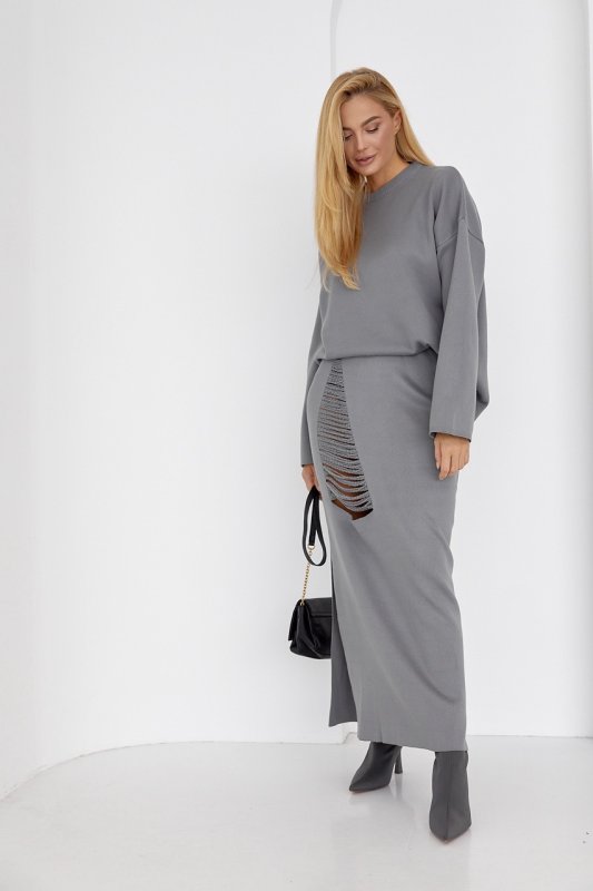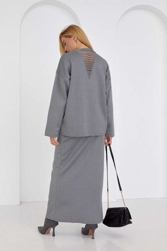 Оригинальный костюм-двойка, состоящий из свободного джемпера и прямой юбки с распоркой - твой готовый к выходу look, который ты также можешь комбинировать с другой модной одеждой.
