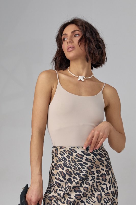 Эта модель выполнена из эластичной ткани, которая хорошо тянется. Низ изделия застегивается на кнопки. Тонкие бретели-резинки идут без регулировки длины. Спереди и сзади боди дополнено короткой подкладкой с основной ткани, которая позволяет изделию не просвечивается.