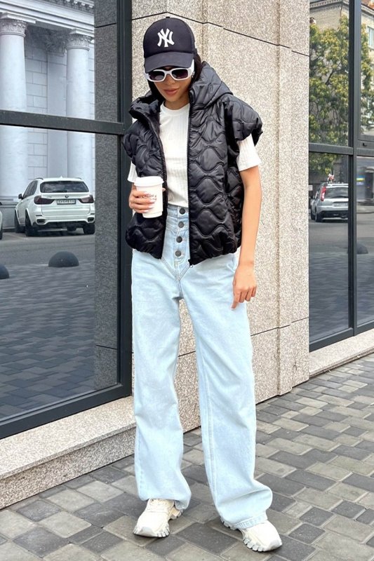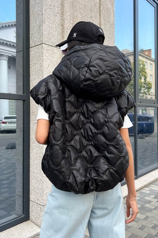 Модная укороченная жилетка на молнии эластичным элементом на поясе, воротником-стойкой и объемным капюшоном.